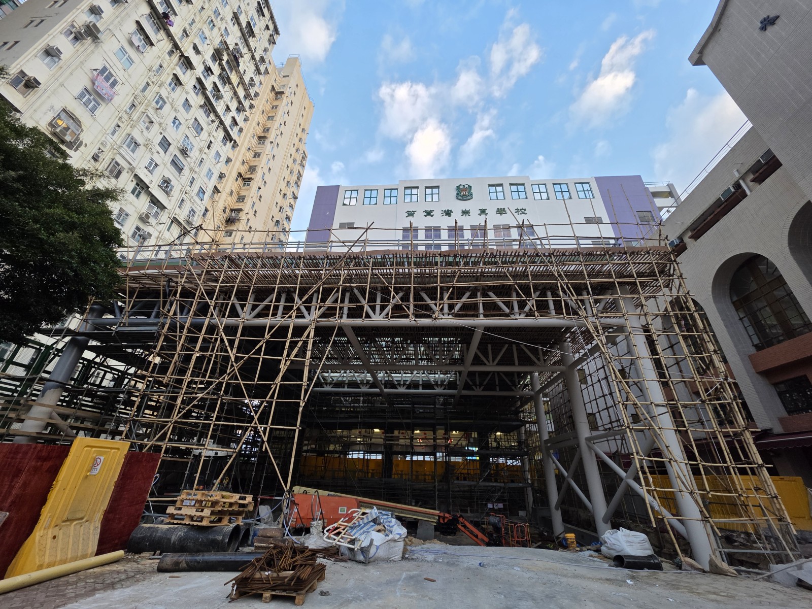 學校籃球場上蓋工程已經進入新階段。