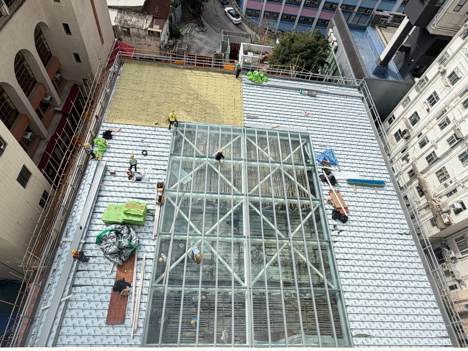 目前上蓋的支架已經全部鋪設完成,接下來將進行上蓋及透光玻璃的鋪設工作。工程進度理想,相信不久的將來,同學們就便能在上蓋下打籃球了。