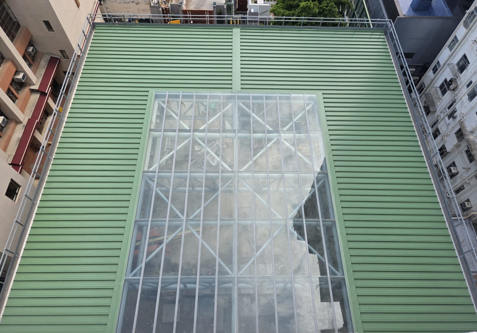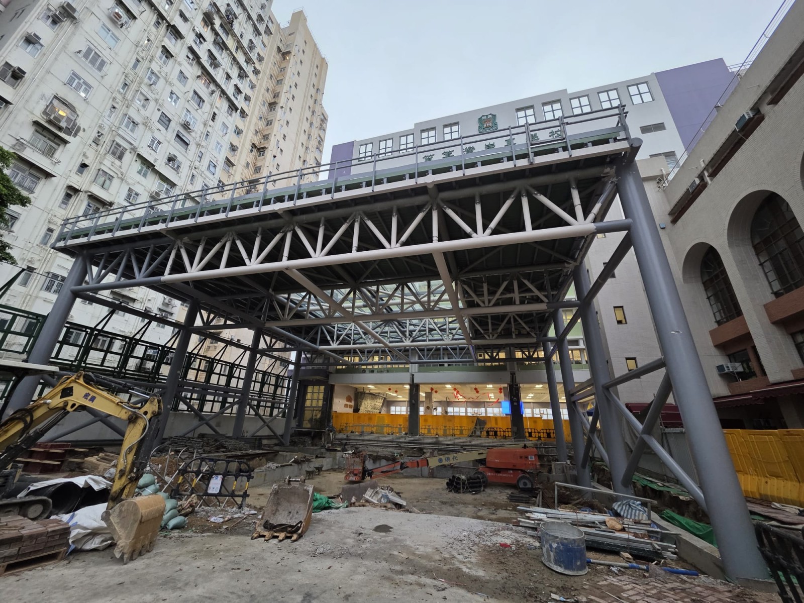 學校籃球場上蓋工程進展順利,地下渠務工程和透光玻璃的鋪設工作均已順利完成,因此高台棚架也全部拆除,並邁入新階段地面工程。